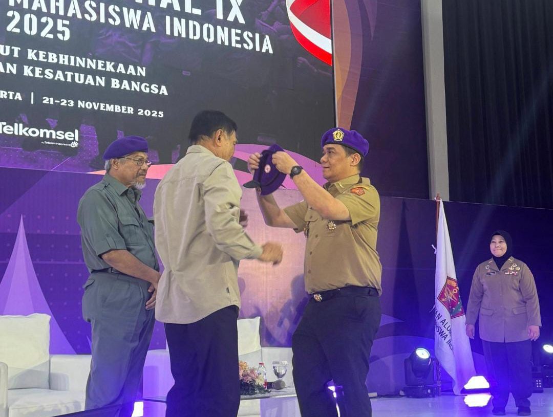 Jakarta – Sekretaris Jenderal Dewan Pimpinan Nasional Ikatan Alumni Resimen Mahasiswa Indonesia (DPN IARMI), Ahmad Riza Patria, resmi menyematkan baret ungu Resimen Mahasiswa kepada Menteri Koordinator Politik dan Keamanan (Menkopolkam) RI, Jenderal (Purn) Djamari Chaniago, dalam rangkaian Munas IX IARMI di Asrama Haji Pondok Gede, Jakarta Timur, Sabtu (22/11/2025). Prosesi ini menandai pengukuhan Jenderal Djamari sebagai Anggota Kehormatan IARMI.